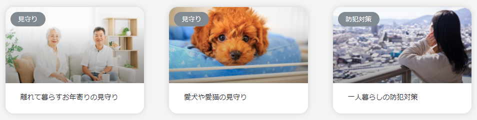 という方は、以下のような「ご利用シーン別パッケージ」ページより、ご自身に合ったシーンを選ぶだけで、弊社がご提案したホームセキュリティをお選びいただけます。